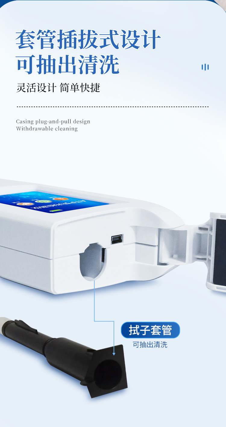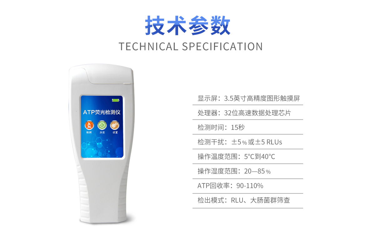 該設(shè)備采用生物化學(xué)反應(yīng)方法檢測ATP含量,細(xì)菌檢測儀基于螢火蟲發(fā)光原理,利用“熒光素酶—熒光素體系”快速檢測三磷酸腺苷(ATP)。ATP拭子含有可以裂解細(xì)胞膜的試劑,能將細(xì)胞內(nèi)ATP釋放出來,與試劑中含有的特異性酶發(fā)生反應(yīng),產(chǎn)生光,再用熒光照度計(jì)檢測發(fā)光值,微生物的數(shù)量與發(fā)光值成正比,由于所有生物活細(xì)胞中含有恒量的ATP,所以ATP含量可以清晰地表明樣品中微生物與其他生物殘余的多少,用于判斷衛(wèi)生狀況。