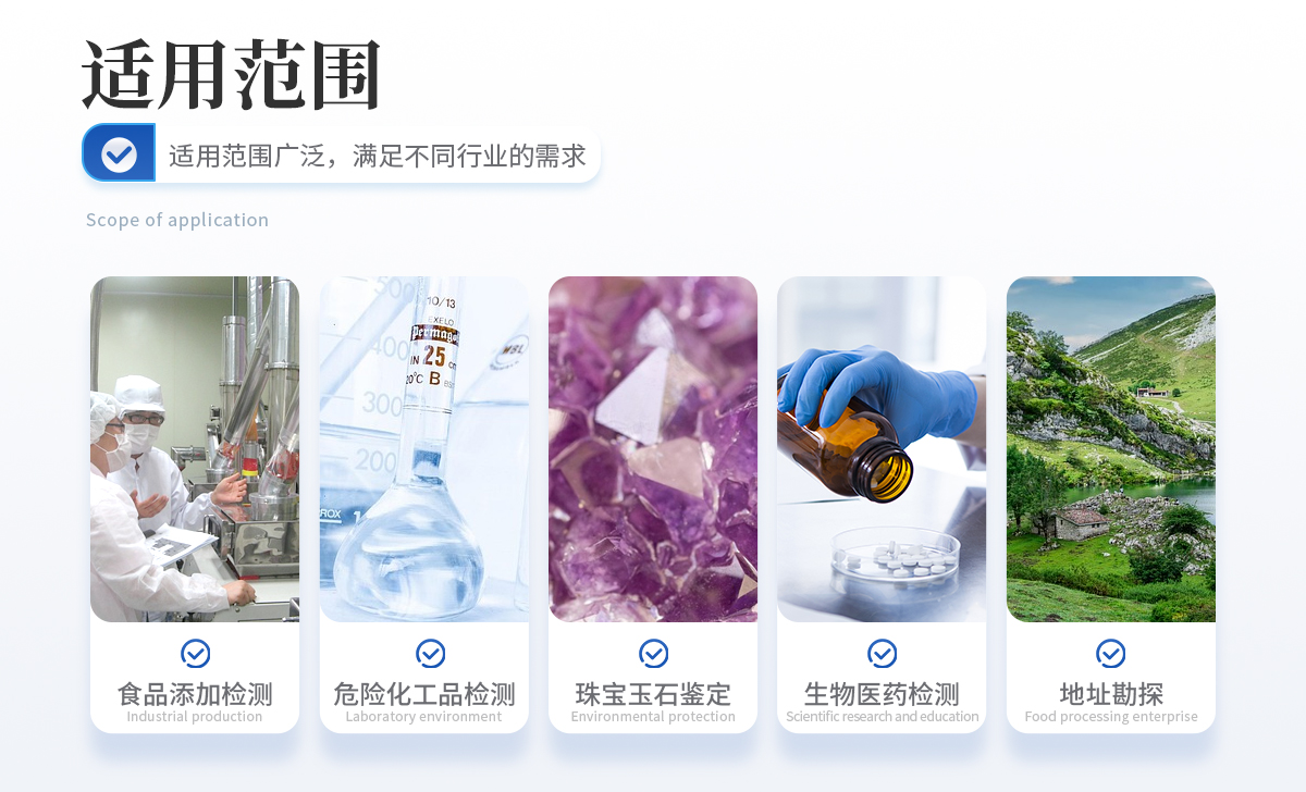 食品違禁添加物、色素添加、農獸藥殘留檢測    爆炸物、危險化工品、易燃易爆品檢測    珠寶玉石鑒定、文物鑒別    生物醫藥檢測、材料表征、地址勘探等    其他各類訂制應用