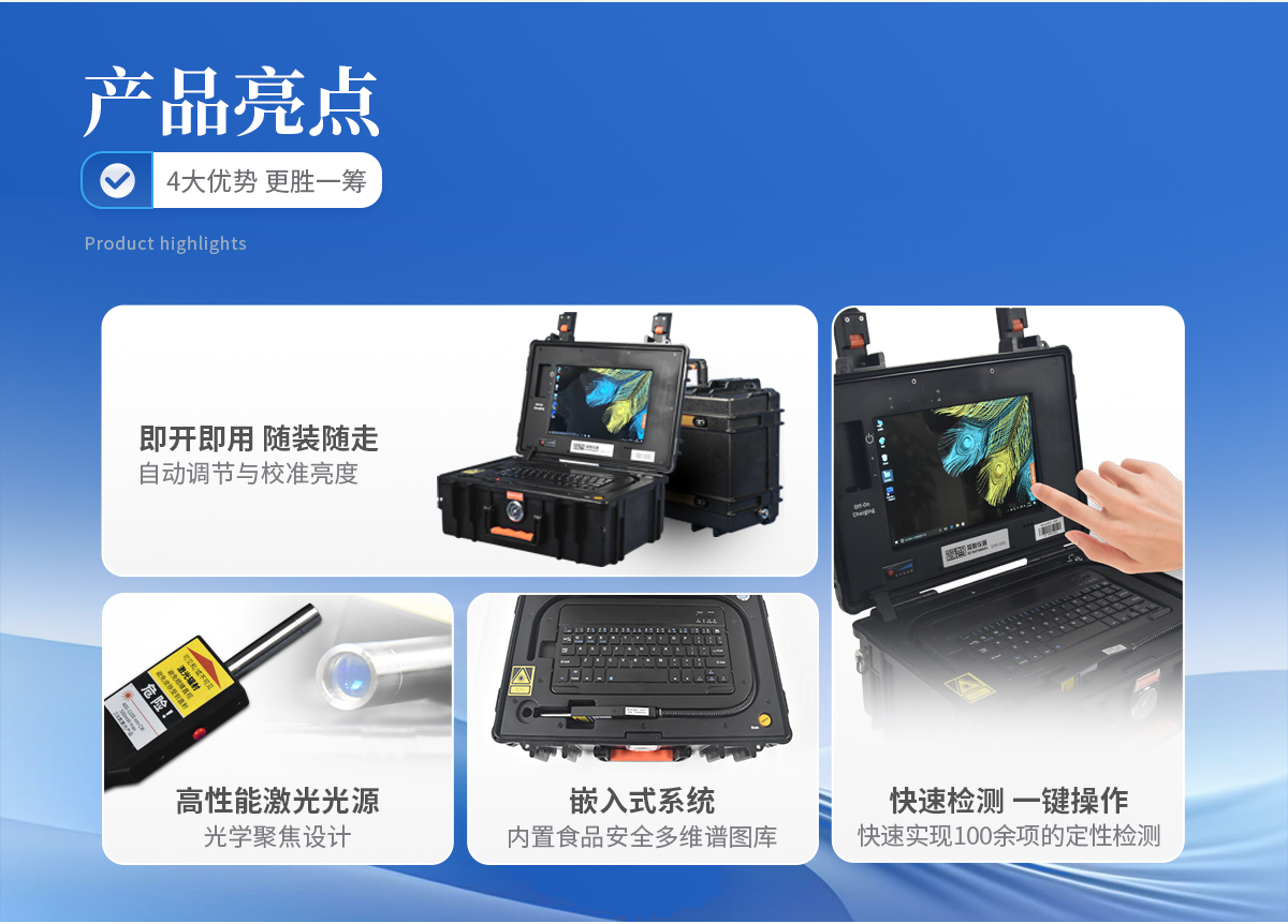 更專業    785nm光源:有效抑制熒光,適合便攜式移動應用    超寬的光譜范圍:檢測物質種類更多    更高的信噪比:超強的微小信號探測能力    優質激光光源:數字可調高功率輸出,窄線寬保障譜圖質量    更便捷    光學聚焦設計:可以隔著塑料袋、玻璃瓶直接檢測    快速自穩定光源:機器啟動無預熱時間,即開即用    超快檢測速度:一秒出結果    便攜式設計:獨立可充電電源供電,隨裝隨走,適合各種現場快檢    更貼合應用    在線譜圖庫:提供各行業應用多維譜圖庫,支持在線升級    專業分析算法:智能解譜,自動匹配,多組分分析    行業應用軟件:提供針對行業專用軟件,支持客戶訂制