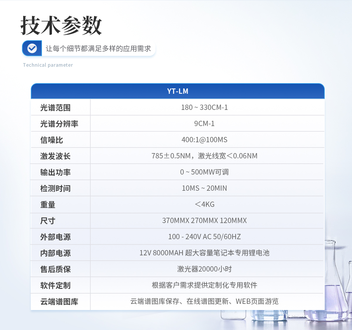 規格:YT-LM標準版    光譜范圍:180 ~ 3300cm-1    光譜分辨率:9cm-1    信噪比:400:1@100ms    激發波長:785+0.5nm,激光線寬< 0.06 nm    輸出功率:0~ 500mW可調    檢測時間:10ms ~ 20min    重量:<4kg    尺寸:370mmx 270mmx 120mm    外部電源:100-240V AC 50/60Hz    內部電源:12V 8000mAH 超大容量筆記本專用鋰電池    售后質保:激光器20000小時    軟件定制:根據客戶需求提供定制化專用軟件    云端譜圖庫:支持云端譜圖保存、 在線譜圖更新、WEB 頁面瀏覽