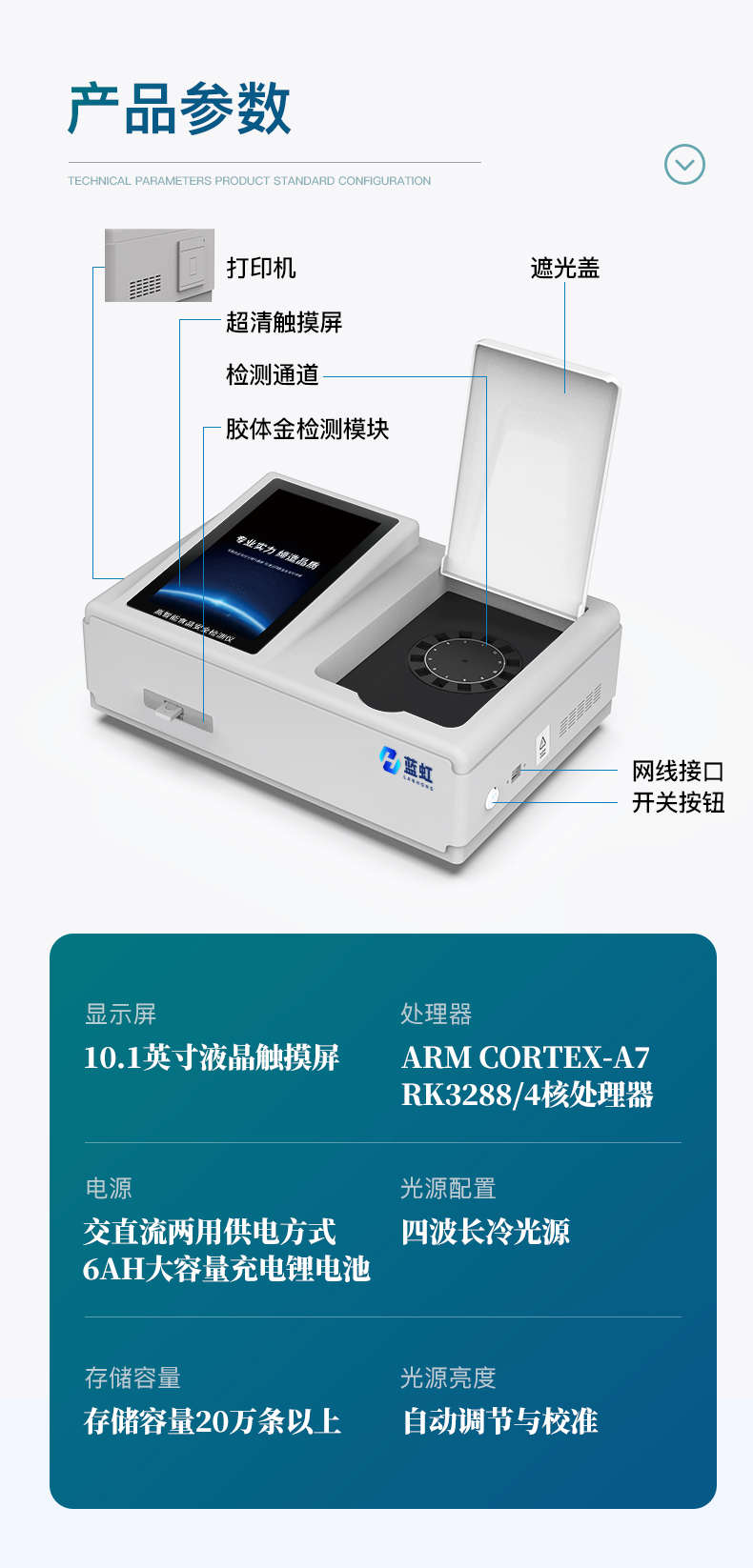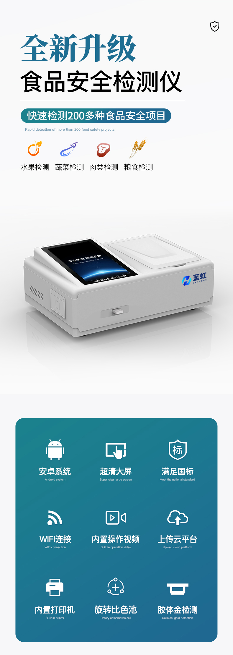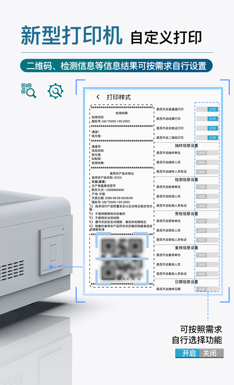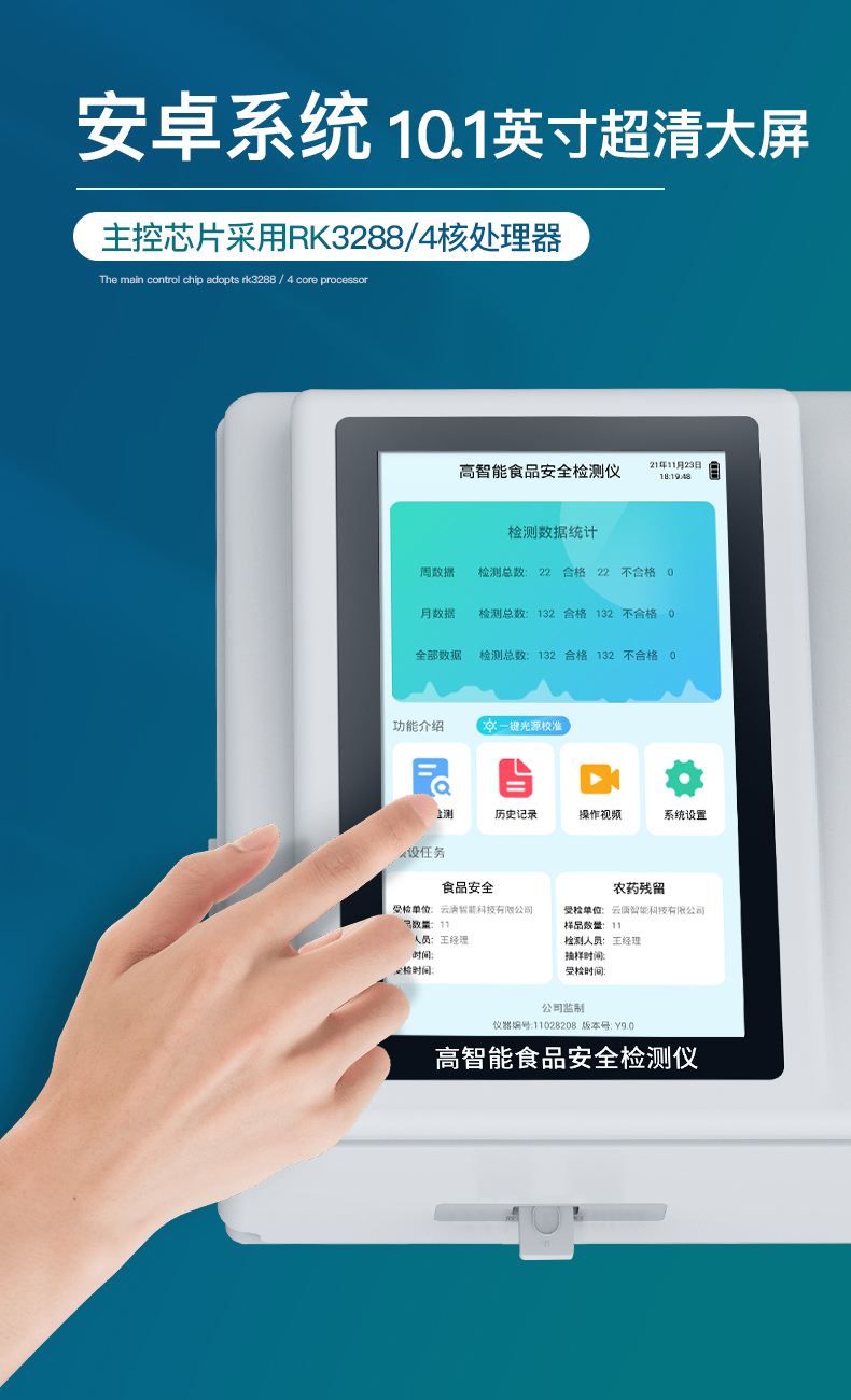 儀器采用手提式一體化系統檢測技術,將分光光度模塊、數字化管理模塊、無線通訊模塊高度集成于一體,支持檢測200種食品安全檢測項目,同時預留升級檢測方法。儀器檢測模塊標準化、智能化,檢測項目可隨意自由組合。檢測箱體內置多個標準檢測單元,檢測模塊可以調整配置。 顯示屏幕:儀器采用10.1英寸豎向液晶觸摸屏顯,搭配運行安卓智能操作系統,主控芯片采用ARM Cortex-A7,RK3288/4核處理器,主頻1.88Ghz,操作方便,性能更強。 檢測通道:≥12通道;采用精密旋轉比色池設計,使用同芯片同光源校準精度,解決不同光源之間的誤差值,更加準確**。(1-12通道間誤差0.1%,***:**202022821055.2) 儀器光源:高精度進口四波長冷光源,每個通道均配置 410、520、590、630nm 波長光源,標配**的光路切換裝置,專利光路切換功能可實現64波長,并且所有檢測項目可實現所有通道同時檢測。 設備可一鍵校準,自動保存校準數據,自動對比校驗,得到精準光源,采用Android SP存儲數據,光源數據永不丟失,方便每一次使用。 通訊接口:配備無線通信模塊、可選配4G(APN)通訊模塊和藍牙傳輸,同時具有雙USB接口以及RJ45網線接口,可以多方式實現數據保存及數據傳輸。存儲方式:支持U盤存儲,標準USB接口,免驅動安裝。檢測結果存儲容量20萬條以上,可生成Excel表格進行拷貝,并具有登錄保護功能。智能化操作系統:1)操作系統:儀器可在同一檢測界面自動對應相關檢測通道,一次性選擇1-12個樣品名稱,無需退出界面,節省操作時間。并可以對每個通道屬性和樣品信息單獨進行編輯,例如送檢單位、人員,檢測人員等,打印時勾選打印顯示。2)數據集成系統:設備首頁自動匯總分析檢測數據,包含:周檢測數據、月檢測數據,全部檢測總數量,均包含檢測總數,合格數,不合格數,以及相關柱形分析圖,各項檢測數據一目了然,無需電腦查詢,更加快捷直觀。3)數據庫系統:十幾項數據庫分類管理儀器:包含項目類型、項目數據、檢測數據、歷史記錄、國標信息、曲線信息、采樣信息、檢測信息、受檢信息、復核信息、圖表信息、光源校準信息、打印樣式信息、樣品庫信息等等,數據庫之間互相協調聯動保證數據的真實完整性。同時產品數據庫以及歷史檢測記錄支持一鍵檢索功能。4)限量規判系統:具有限量查詢、添加物質合規判定系統。檢測出結果后,系統自動調用系統數據庫中相關國標進行比對判定,客觀顯示判定結果是否合格。5)項目預設系統:儀器具有任務預設模塊,一鍵提前預設,給出方便快捷的新檢測方案,每一個任務分別可以設置不同的樣品、批次、編號、來源、備注、抽樣信息、檢測信息、受檢信息、復核信息等更多信息。樣品送檢時一鍵調取保存信息,并可多次調取,大大提高檢測效率。6)數據監管系統:同步對接監管平臺,數據可局域網和互聯網數據上傳,檢測結果可選擇直接傳至食品安全監管平臺。進行區域食品安全監管及大數據分析處理與數據統計,檢測區域食品安全長短期動態,達到食品安全問題預估、預警。7)打印系統:內置全新打印機,新創自定義打印方式,可按需靈活勾選控制:產品合格證(國家農業部標準要求),二維碼,抽樣信息、檢測信息,受檢信息、復核信息、抽樣日期、檢測日期等信息的打印。供電模式:儀器交直流兩用,直流12V供電,可連接車載電源,可配6ah大容量充電鋰電池,電量可實時顯示,方便戶外流動測試。儀器加入遠程升級功能,可定向分客戶分儀器更新,開機后自動更新,客戶無需任何操作,即可升級全新項目。做到了無需退換機器即可實現實時遠程升級檢測儀器。設備尺寸:(長*寬*高)440*300*180mm儀器加入遠程升級功能,可定向分客戶分儀器更新,開機后自動更新,客戶無需任何操作,即可升級全新項目。做到了無需退換機器即可實現實時遠程升級檢測儀器。