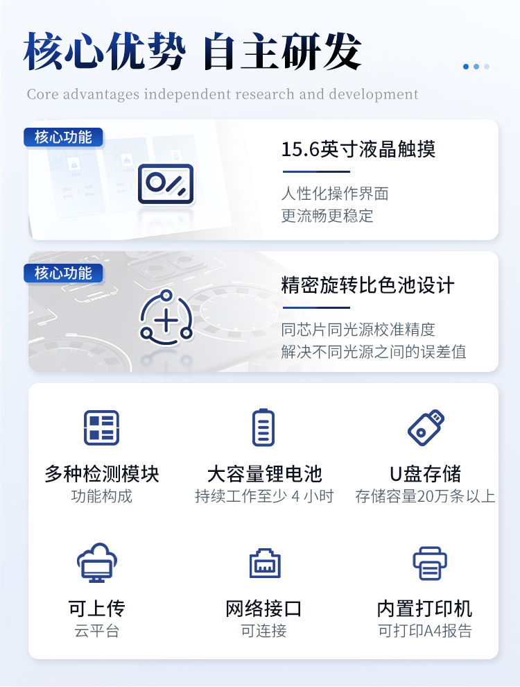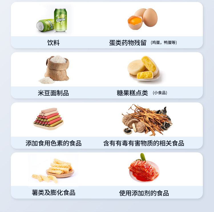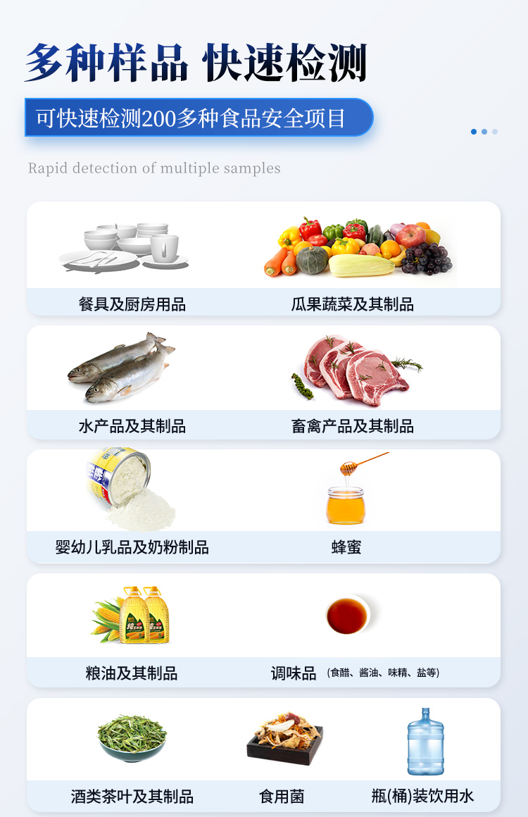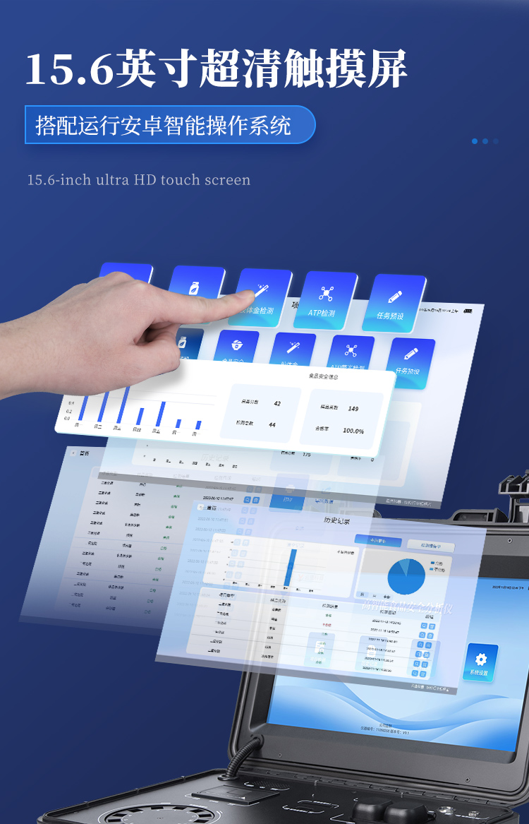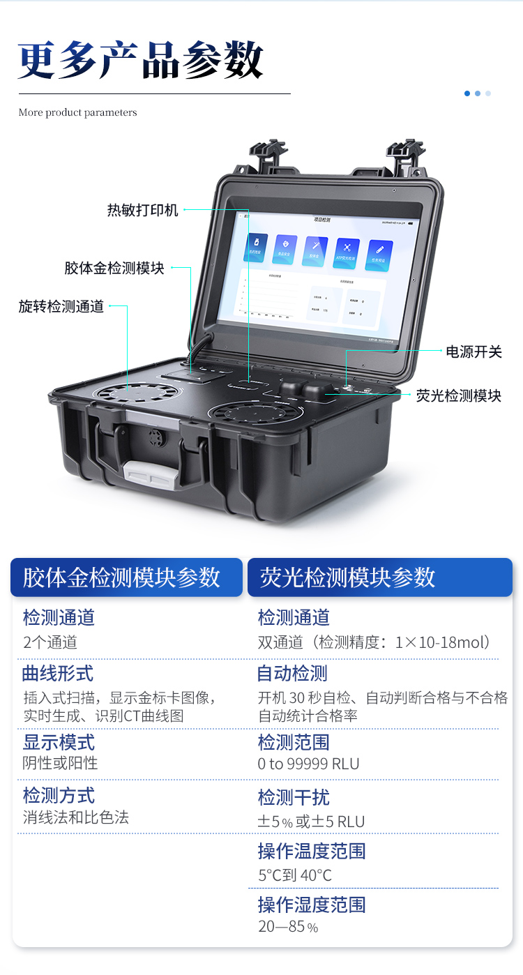 | 1. 功能構成:主要包括分光光度模塊、新型農殘檢測模塊、膠體金檢測模塊、熒光檢測模塊、數字化管理模塊等,所有模塊集成一體,可快速檢測200多種食品安全項目,如獸藥殘留、農藥殘留、非法添加劑、細菌數值等指標。 | 2. 檢測樣品種類:餐具及廚房用品、瓜果蔬菜及其制品、水產品及其制品、畜禽產品及其制品、嬰幼兒乳品及奶粉制品、蜂蜜、糧油及其制品、調味品(食醋、醬油、味精、鹽等)、酒類茶葉及其制品、食用菌、飲料、蛋類藥物殘留(雞蛋,鴨蛋等)、米豆面制品、糖果糕點類(小食品)、薯類及膨化食品、瓶(桶)裝飲用水、添加食用色素的食品、使用添加劑的食品、含有有毒有害物質的相關食品。 | 3、顯示屏幕:儀器采用15.6英寸液晶觸摸屏顯,搭配運行安卓智能操作系統,主控芯片采用ARM Cortex-A7,RK3288/4核處理器,主頻1.88Ghz,操作方便,性能更強。 | 4、供電模式:儀器交直流兩用,直流12V供電,可連接車載電源,配18ah大容量充電鋰電池,電量可實時顯示,無外部電源條件下可持續工作至少 4 小時。 | 5、檢測通道:≥24通道;采用精密旋轉比色池設計,使用同芯片同光源校準精度,解決不同光源之間的誤差值,更加準確**,采用高精度進口四波長冷光源,每個通道均配置 410、520、590、630nm 波長光源,標配**的光路切換裝置,專利光路切換功能可實現64波長,并且所有檢測項目可實現所有通道同時檢測. | 6、通訊接口:配備無線通信模塊、4G(APN)通訊模塊、藍牙傳輸,同時具有雙USB接口以及RJ45網線接口,可以多方式實現數據保存及數據傳輸。 | 7、存儲方式:支持U盤存儲,兩個標準USB接口,免驅動安裝。檢測結果存儲容量20萬條以上,可生成Excel表格進行拷貝,并具有登錄保護功能。 | 8、操作系統:儀器可在同一檢測界面自動對應相關檢測通道,一次性選擇不少于11個樣品名稱,無需退出界面,節省操作時間。并可以對每個通道屬性和樣品信息單獨進行編輯,例如送檢單位、人員,檢測人員等,打印時勾選打印顯示。 | 9、數據集成系統:設備首頁自動匯總分析檢測數據,包含:周檢測數據、月檢測數據,全部檢測總數量,包含檢測總數,合格數,不合格數,以及相關柱形分析圖,各項檢測數據一目了然,無需電腦查詢,更加快捷直觀。 | 10、數據庫系統:十幾項數據庫分類管理儀器:包含項目類型、項目數據、檢測數據、歷史記錄、國標信息、曲線信息、采樣信息、檢測信息、受檢信息、復核信息、圖表信息、光源校準信息、打印樣式信息、樣品庫信息等等,數據庫之間互相協調聯動保證數據的真實完整性。同時產品數據庫以及歷史檢測記錄支持一鍵檢索功能。 | 11、限量規判系統:具有限量查詢、添加物質合規判定系統。檢測出結果后,系統自動調用系統數據庫中相關國標進行比對判定,客觀顯示判定結果是否合格。 | 12、項目預設系統:儀器具有任務預設模塊,一鍵提前預設,給出方便快捷的新檢測方案,每一個任務分別可以設置不同的樣品、批次、編號、來源、備注、抽樣信息、檢測信息、受檢信息、復核信息等更多信息。樣品送檢時一鍵調取保存信息,并可多次調取,適用于大批量檢測業務,可以大大提高檢測效率。 | 13、數據監管系統:同步對接監管平臺,數據可局域網和互聯網數據上傳,檢測結果可直接傳至食品安全監管平臺。進行區域食品安全監管及大數據分析處理與數據統計,監測區域食品安全長短期動態及問題預估、預警。 | 14.1、全新打印系統:內置全新打印機,新創自定義打印方式,可按需靈活勾選控制:產品合格證(國家農業部標準要求),二維碼,抽樣信息、檢測信息,受檢信息、復核信息、抽樣日期、檢測日期等信息的打印。 | 14.2、A4紙版本報告打印功能:設備擁有兩種結果展示方式,可以自動生成A4打印模板和小票打印模板兩種樣式,可通過WiFi及網線等方式連接外置打印機可進行打印。 | 15、膠體金檢測模塊:采用單通道CMOS成像處理技術及膠體金免疫層析技術,可讀取膠體金卡數據,自動采集、處理分析,將檢測結果顯示,并可根據參考限值自動判斷檢測結果,可檢測常見的獸藥殘留、生物毒素、抗生素、違禁添加物等。 | 15.1、可即時檢測單聯卡及三聯卡; | 15.2、檢測通道:2個通道; | 15.3、檢測方式:消線法和比色法; | 15.4、顯示模式:陰性或陽性; | 15.5、曲線形式:插入式掃描方式,顯示金標卡圖像,實時生成、識別CT曲線圖,無需手動調整。兼容市場上其他金標卡,使用耗材不受限制。 | 16、熒光檢測模塊:快速檢測水質中微生物、固體物細菌含量。利用“熒光素酶—熒光素體系”快速檢測三磷酸腺苷(ATP)。以ATP含量表明樣品中微生物與其他生物殘余得多少,用于判斷衛生狀況。 適用于食品、餐具、手、液體等表面及水質潔凈度的檢測。 | 16.1、檢測通道:雙通道 檢測精度:********** | 16.2、檢測范圍:0 to 99999 RLU | 16.3、檢測時間:15 秒 | 16.4、檢測干擾:±5﹪或±5 RLU | 16.5、操作溫度范圍:5℃到 40℃ | 16.6、操作濕度范圍:20—85﹪ | 16.7、開機 30 秒自檢、內置自校光源、自動判斷合格與不合格、自動統計合格率 。 | 17、儀器具備遠程升級功能,可定向分客戶分儀器更新,開機后自動更新,并可持續性免費更新系統版本,無需像傳統產品返廠更新,節省時間及人力成本并避免了物流運輸返廠升級導致設備損壞的潛在風險。 |
