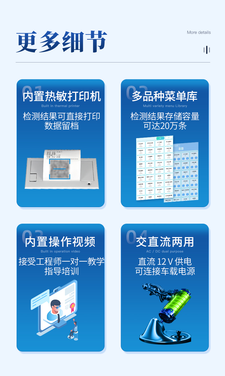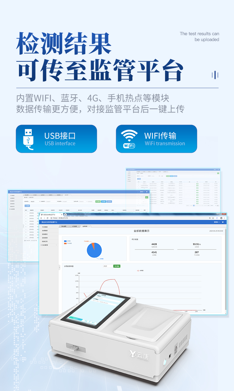 儀器檢測(cè)系統(tǒng)擁有龐大數(shù)據(jù)庫(kù),并且構(gòu)建了完善的檢索、修訂功能。食品庫(kù)涵蓋多種樣品名稱,可按需添加或刪除、編輯樣品名稱;產(chǎn)品數(shù)據(jù)庫(kù)以及歷史檢測(cè)記錄支持一鍵檢索功能。系統(tǒng)打印自定義化,打印格式多樣化,產(chǎn)品合格證(國(guó)家標(biāo)準(zhǔn)要求),二維碼,抽樣信息、檢測(cè)信息,受檢信息、復(fù)核信息、抽樣日期、檢測(cè)日期等信息結(jié)果,可按需求自行設(shè)置打印內(nèi)容。A4紙版本報(bào)告打印功能(可選配):設(shè)備擁有兩種結(jié)果展示方式,可以自動(dòng)生成A4打印模板和小票打印模板兩種樣式,可通過WiFi及網(wǎng)線等方式鏈接外置打印機(jī)可進(jìn)行打印儀器具有 wifi 聯(lián)網(wǎng)上傳、RJ45網(wǎng)線連接功能,可以快速上傳數(shù)據(jù)。同步對(duì)接監(jiān)管平臺(tái),數(shù)據(jù)可局域網(wǎng)和互聯(lián)網(wǎng)數(shù)據(jù)上傳,檢測(cè)結(jié)果直接傳至食品安全監(jiān)管平臺(tái)。進(jìn)行區(qū)域食品安全監(jiān)管及大數(shù)據(jù)分析處理與數(shù)據(jù)統(tǒng)計(jì),檢測(cè)區(qū)域食品安全長(zhǎng)短期動(dòng)態(tài),達(dá)到食品安全問題預(yù)估、預(yù)警。設(shè)備支持U盤存儲(chǔ),標(biāo)準(zhǔn)USB接口,免驅(qū)動(dòng)安裝。檢測(cè)結(jié)果存儲(chǔ)容量20萬(wàn)條以上,可生成Excel表格,進(jìn)行一鍵拷貝,并具有登錄保護(hù)功能,可設(shè)置用戶名及密碼,規(guī)范不同人員操作權(quán)限,防止非工作人員操作,并且可以進(jìn)行重新校準(zhǔn)、鎖定、恢復(fù)出廠設(shè)置功能。儀器固件可升級(jí),后期檢測(cè)項(xiàng)目可擴(kuò)充。儀器具備遠(yuǎn)程升級(jí)功能,可定向分客戶分儀器更新,開機(jī)后自動(dòng)更新,并可持續(xù)性免費(fèi)更新系統(tǒng)版本,無(wú)需像傳統(tǒng)產(chǎn)品返廠更新,節(jié)省時(shí)間及人力成本并避免了物流運(yùn)輸返廠升級(jí)導(dǎo)致設(shè)備損壞的潛在風(fēng)險(xiǎn)。