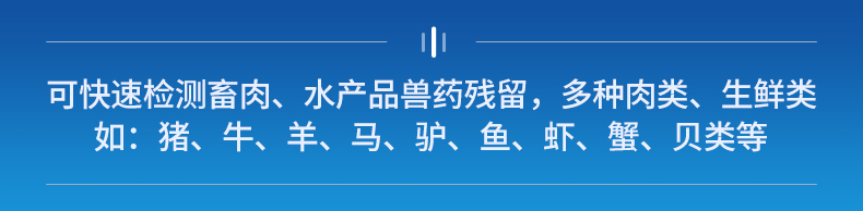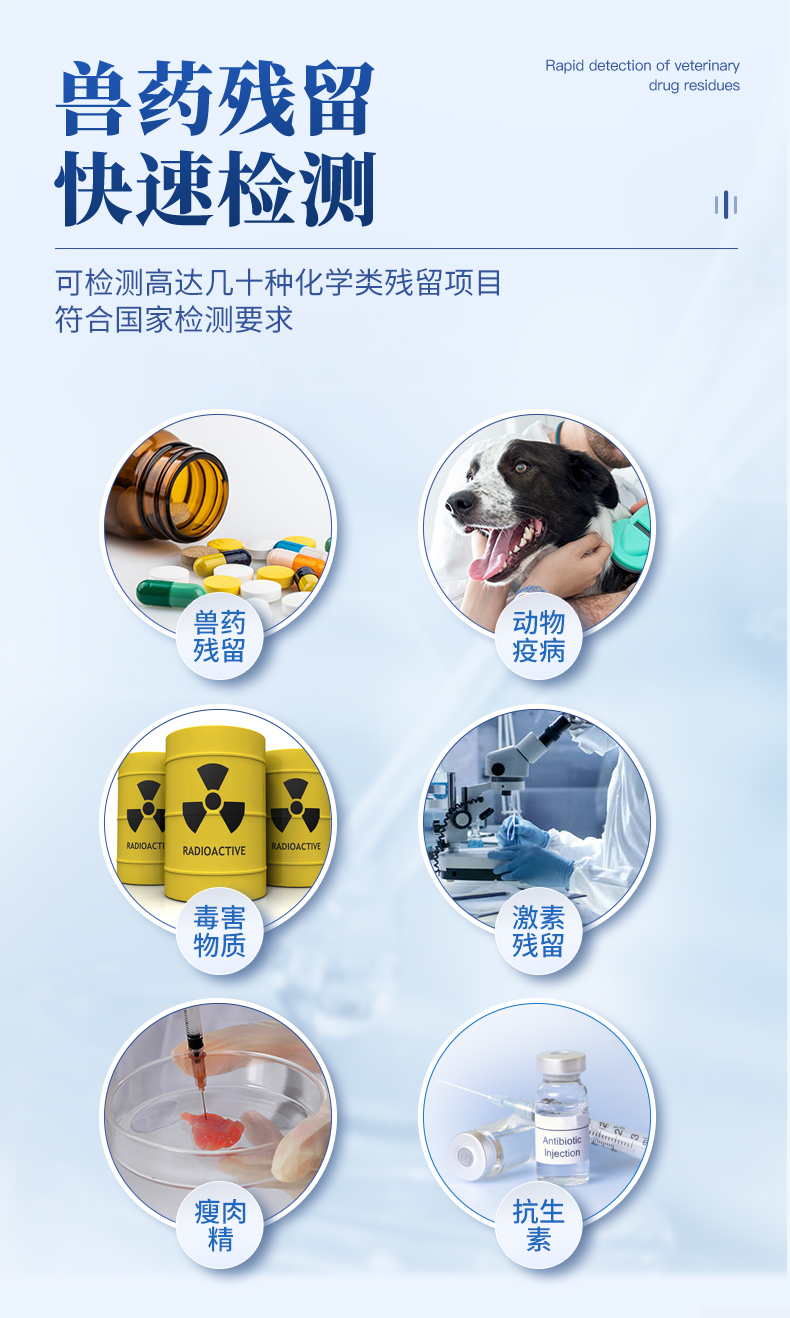 瘦肉精激素:鹽酸克倫特羅、沙丁胺醇、萊克多巴胺、己烯雌酚等抗生素殘留:四環(huán)素類、硝基呋喃類、磺胺類、β-興奮劑類、沙星類、磺胺類、喹諾酮類,甲砜霉素,氟苯尼考,金剛烷胺、替米考星、慶大霉素、林可霉素、鏈霉素、恩諾沙星、環(huán)丙沙星、頭孢啦啶、青霉素、阿莫西林等水產(chǎn)品安全類:孔雀石綠、氯霉素、呋喃妥因、呋喃西林、呋喃它酮、呋喃唑酮等蛋類藥物殘留:氯霉素,四環(huán)素,磺胺類,喹諾酮類,呋喃西林,呋喃它酮,呋喃妥因,呋喃唑酮,氟苯尼考,阿莫西林、頭孢氨芐、紅霉素、鏈霉素等動(dòng)物疫病類:禽流感、新城疫、牛羊口蹄疫、牛羊結(jié)核病、牛羊包蟲、牛羊布病、小反芻獸、豬藍(lán)耳病毒、豬瘟病毒、豬偽狂犬病毒、豬細(xì)小、豬圓環(huán)、犬細(xì)小病毒、犬瘟熱病毒、犬狂犬病毒等真菌毒素殘留:食用油、糧食及飼料中黃曲霉毒素B1、黃曲霉毒素總量,奶中黃曲霉毒素M1、嘔吐毒素、玉米赤霉烯酮、赭曲霉毒素A、T2毒素、伏馬毒素等