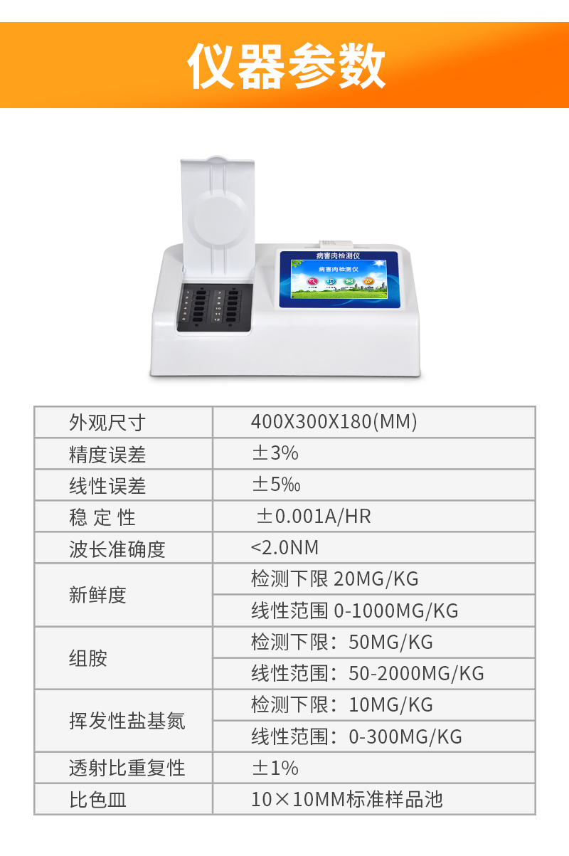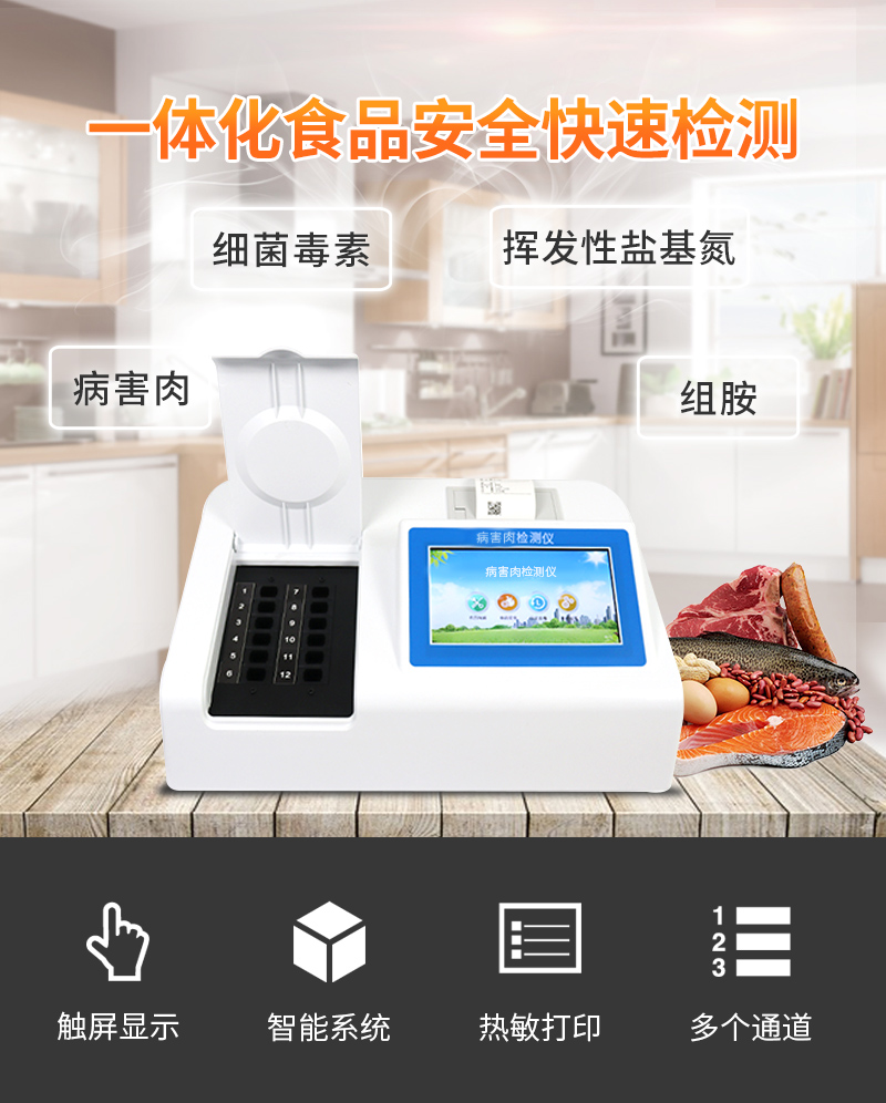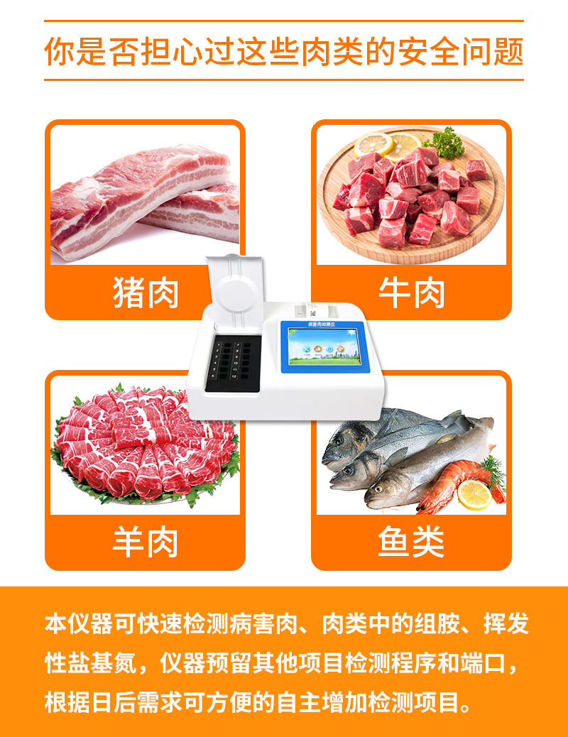 可快速檢測病害肉、組胺、揮發(fā)性鹽基氮,儀器預留其他項目檢測程序和端口,根據(jù)日后需求可方便的自主增加檢測項目。