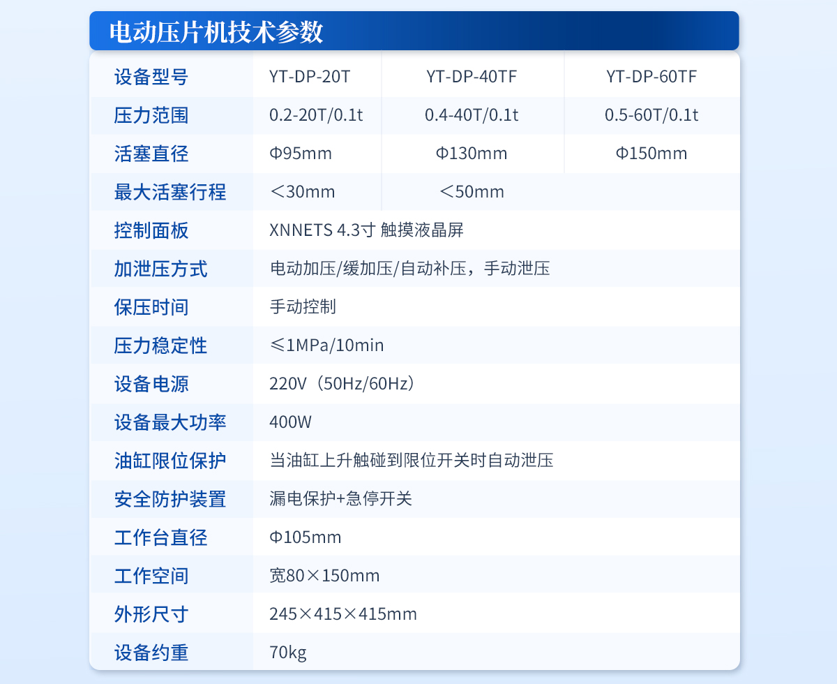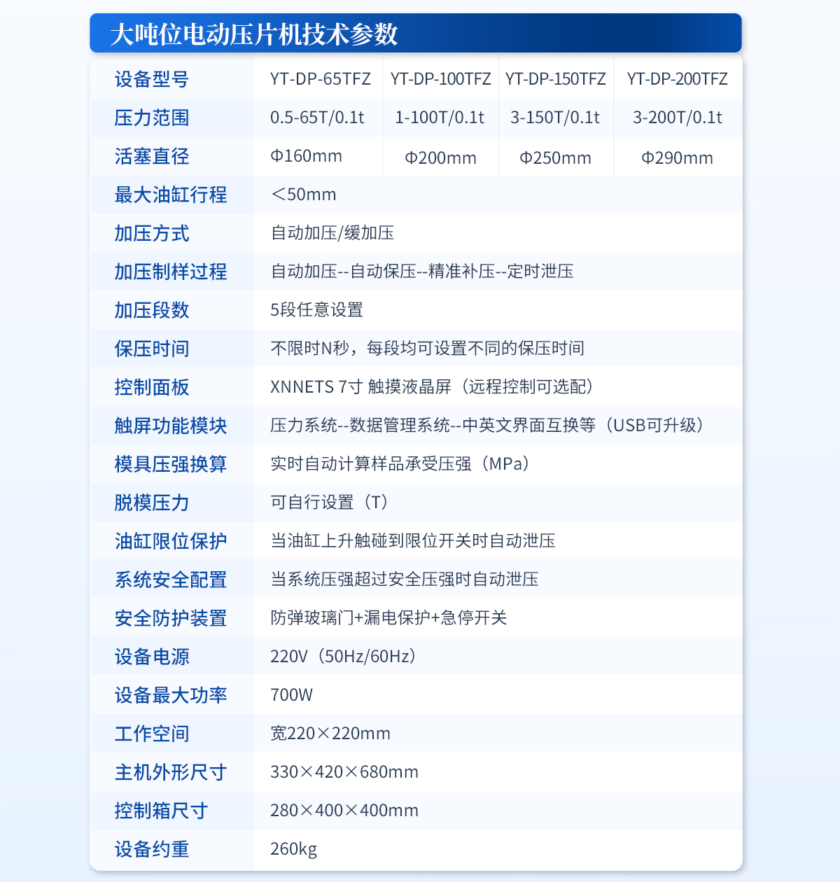 | 設備型號:YT-ZP-20T | 壓力范圍:0.2-20T/0.1t | 油缸直徑:Ф95mm | 油缸行程 :<30mm | 加壓方式:自動加壓/緩加壓 | 加壓制樣過程:自動加壓--自動保壓--精準補壓--定時泄壓 | 加壓段數:5段任意設置 | 保壓時間:不限時N秒,每段均可設置不同的保壓時間 | 控制面板:XNNETS 7寸 觸摸液晶屏(遠程控制可選配) | 觸屏功能模塊:壓力系統--數據管理系統--中英文界面互換等(USB可升級) | 模具壓強換算:實時自動計算樣品承受壓強(MPa) | 脫模壓力:可自行設置(T) | 油缸限位保護:當油缸上升觸碰到限位開關時自動泄壓 | 系統安全配置:當系統壓強超過安全值時自動泄壓 | 安全防護裝置:防彈玻璃門+漏電保護+急停開關 | 設備電源:220V(50Hz/60Hz) | 設備**功率:400W | 工作空間:寬145×160mm | 外形尺寸 :230×390×420mm | 設備估重 :80-85kg | 配置說明:壓片機1臺,模具選配!可根據需求定制壓片機或模具 |